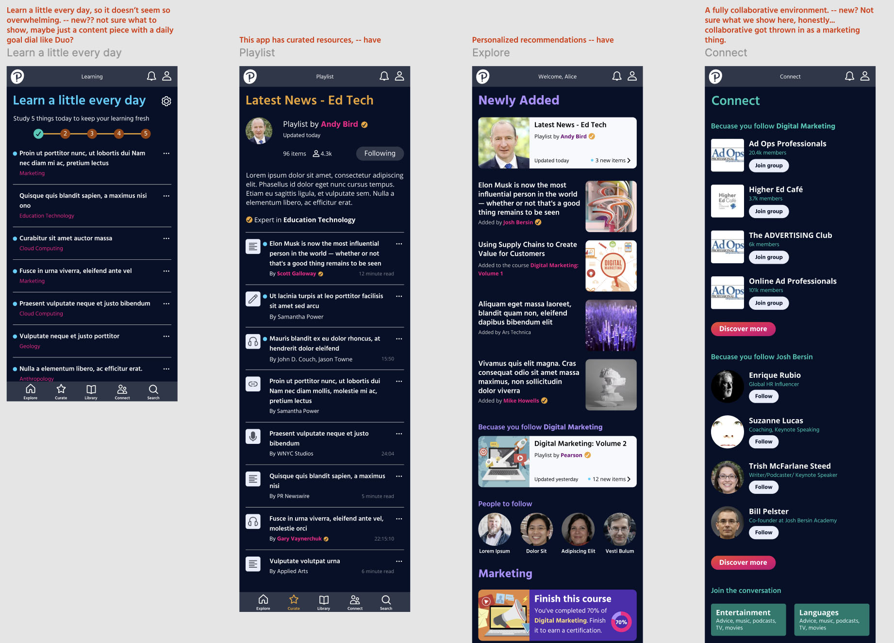 As part of my work I have led design workshops and assisted teams in ideation exercises and brainstorming. This process helps people to take what are oftentimes quite vague ideas and goals and make then into more actionable tests and concepts. I am a big believer in the prototype first way of working and have led with that method many times to create experiments and micro-prototypes that help to further define problem statements and value propositions.