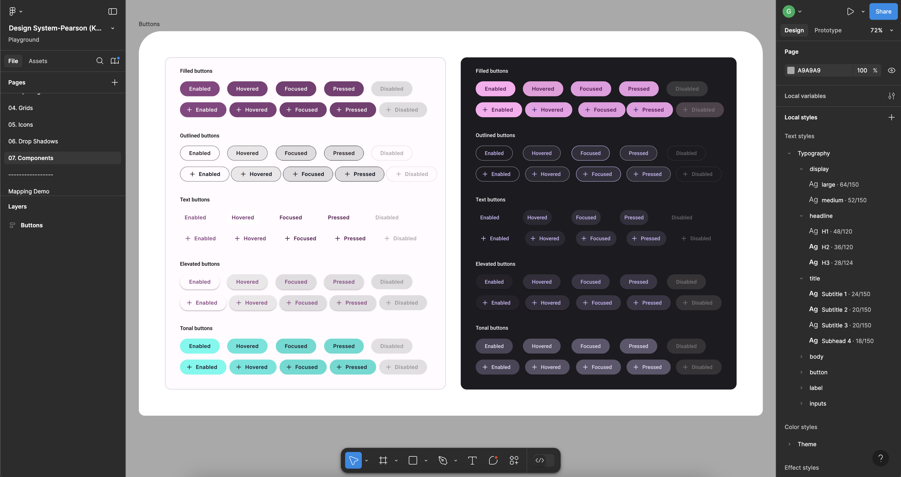 Over time I have created or participated the creation of several design systems. The images shown here are from a web component system that is based on the Pearson branding at that time. The components were built with a token driven workflow where styles and variables in Figma were used to produce a set of CSS variables that were directly used in coding the final interactions.